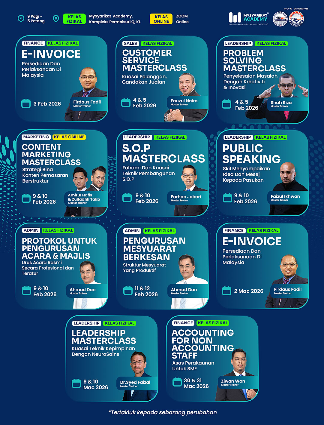 Dengan pengalaman lebih 10 tahun mengendalikan latihan serta ratusan syarikat korporat, swasta dan badan kerajaan, barisan tenaga pengajar kami kini menjadi peneraju dalam membentuk bakat-bakat masa depan dalam pelbagai industri.